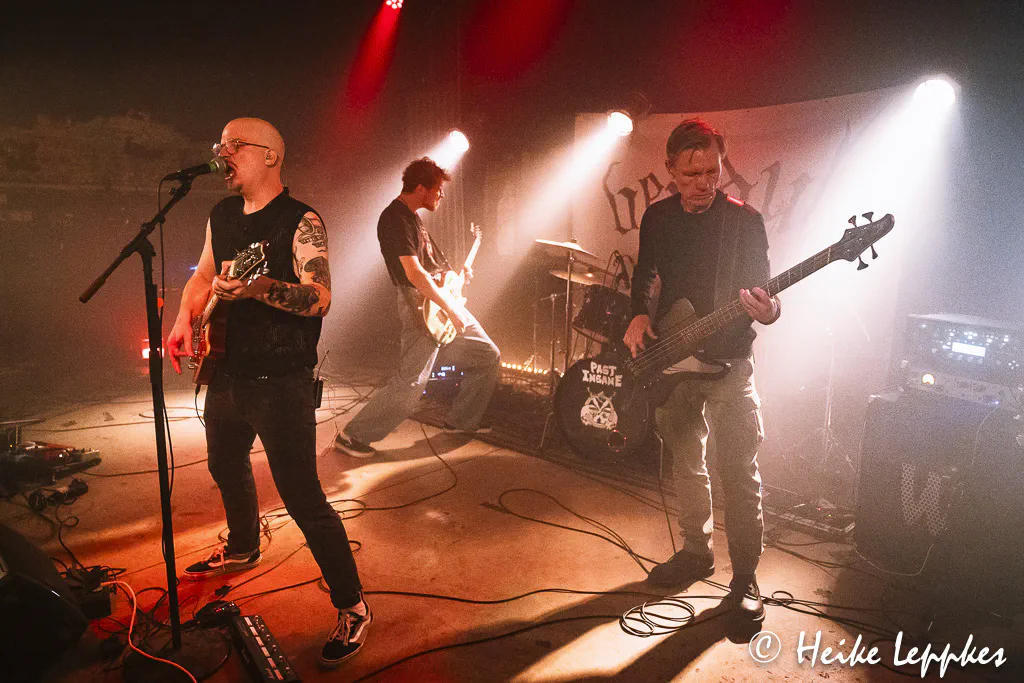 Auch Vendul bringen eine ordentliche Ladung Punk mit ins ROTTSTR5THEATER. Die Band gibt es tatsächlich bereits seit über 10 Jahren, und am 10.10. haben sie ihr neues Album Castle Curtains veröffentlicht, das auf der Setliste mit fünf Songs bedacht wird. Als ich vor der Show das spitze Ende des Mikrostocks von Muck sehe, wird mir doch etwas mulmig. Aber bei aller großartigen Theatralik, die er auf die Bühne bringt, behält er doch alles im Auge. Neben Songs vom neuesten Album nehmen uns die drei auch mit in die Bandgeschichte. Sowohl Songs vom 2021er Album Crooked Bogs & Ghastly Swamps, vom 2018er Album Witchtanic Metalpunks und vom Album Driven By Bloodlust aus 2017 haben sie auf die Setliste gepackt. By They Come With The Fog (vom neuen Album) muss ich ja tatsächlich an den Uralt-Gruselfilm The Fog – Nebel des Grauens denken. Gar so grauenvoll wird’s aber bei Vendul nicht.