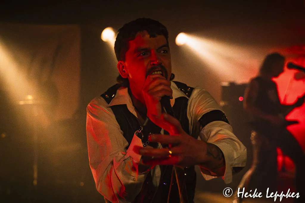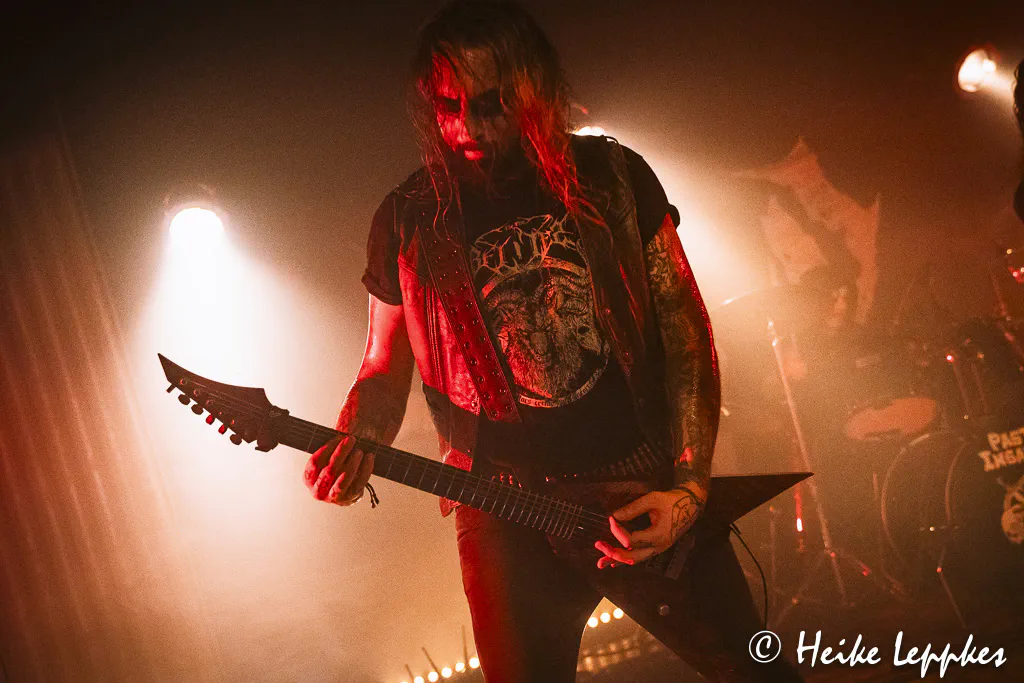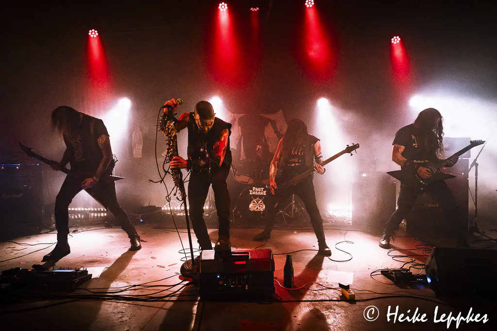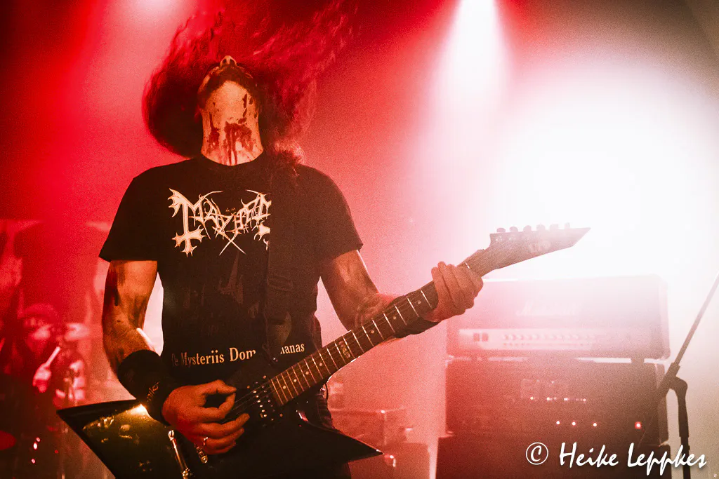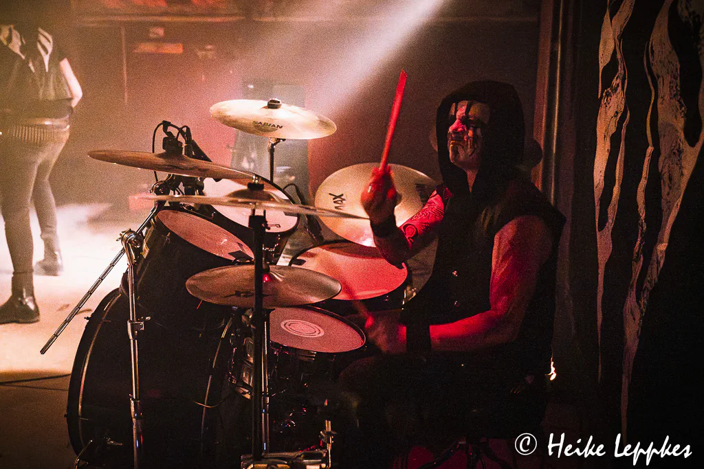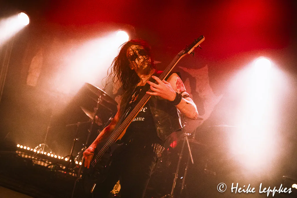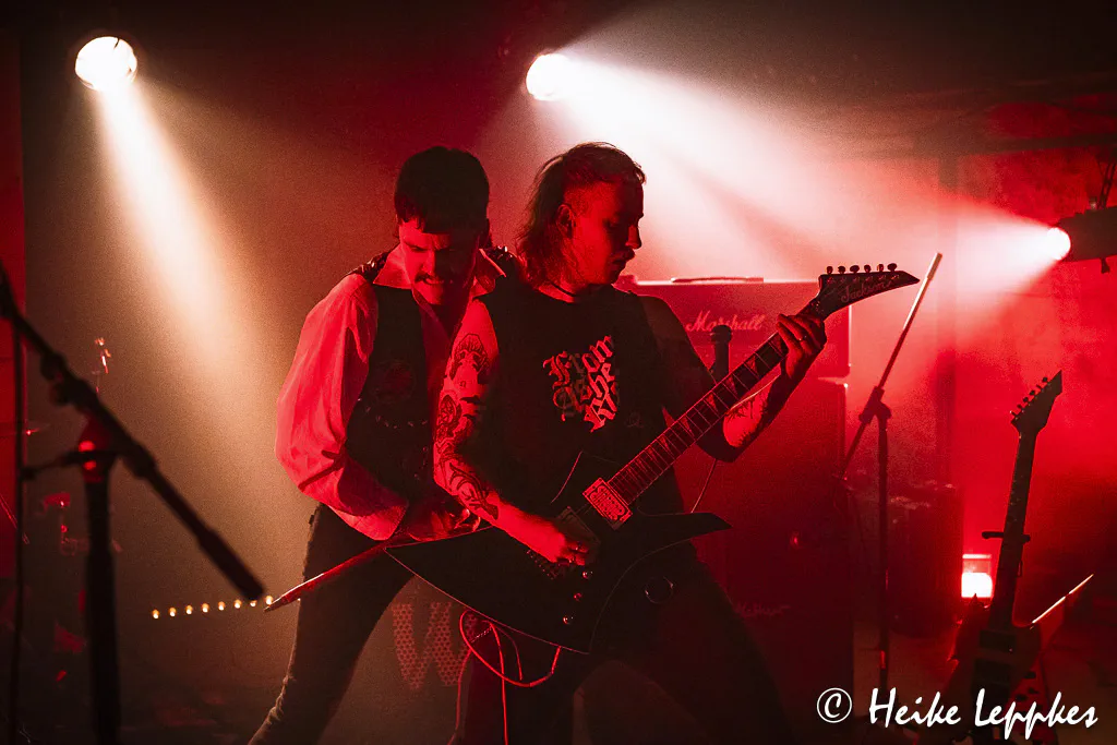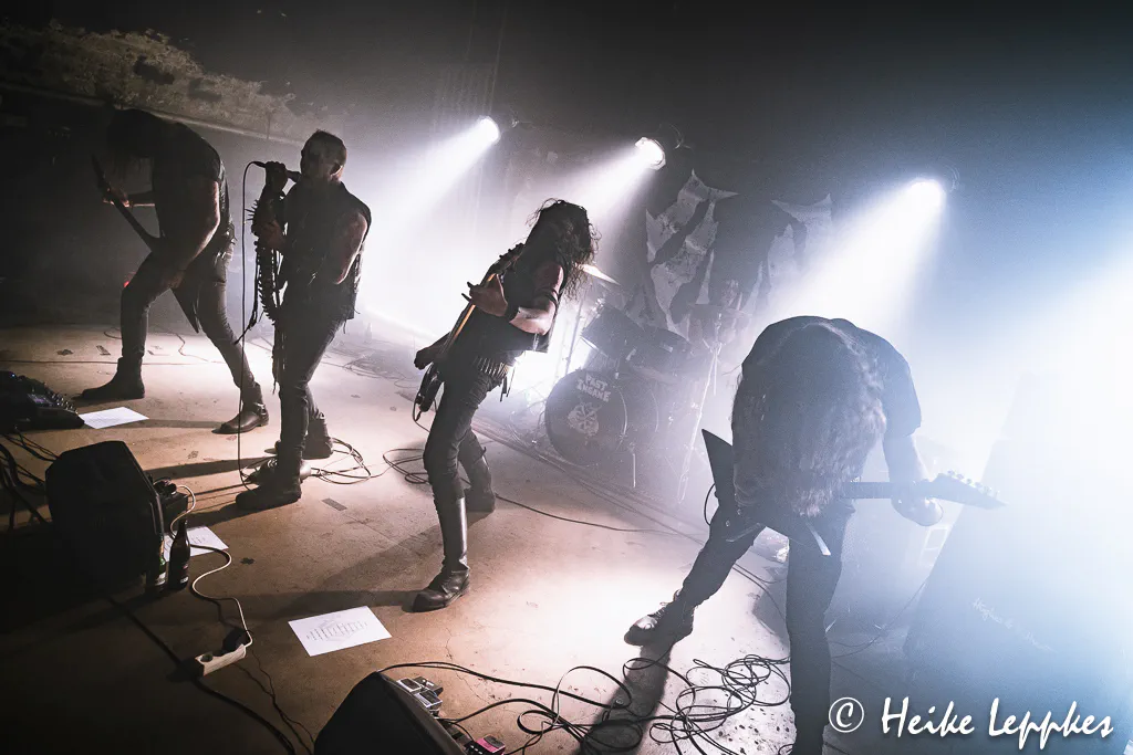 Noch ein paar Jahre länger als Vendul gibt es Necrotic Woods bereits, die Band wurde im Jahr 2004 gegründet. Wechsel in der Bandbesetzung gab’s erstaunlich wenige, wobei ich sie heute zum ersten Mal mit ihren beiden neuen Gitarristen sehe. Die wurden beide im April vorgestellt, und komplettieren seitdem das Quintett. An den Aufnahmen zum Album waren sie noch nicht beteiligt, da hat Kirill (Pripjat, Ayahuasca und Raptvre) alle Gitarren eingespielt. Aber Gebeine und Mourne haben sich die Songs natürlich längst draufgeschafft und lassen ihre Flitzefinger über die Saiten huschen. Und jetzt gibt’s endlich das, weswegen ich hier bin: Pure fuckin’ Black Metal! Herrschten bei der Show in 2019 noch sommerliche Temperaturen sowohl draußen wie drinnen, ist es heute draußen wesentlich kühler. Aber die Scheinwerfer drinnen strahlen nach wie vor mächtig Hitze ab, und so steht den Jungs bei ihrer krassen Show dann auch ziemlich schnell der Schweiß auf der Stirn. Im Gegensatz zu Vendul gibt’s von Necrotic Woods tatsächlich nur Songs vom Album Perversions Committed On Flesh, aber genau das soll ja heute auch gefeiert werden. Und mit einer Spielzeit von knapp 46 Minuten bringt’s ja auch genau die richtige Länge mit, um in seiner vollen Pracht dargeboten zu werden. Für mich hat’s den Vorteil, dass meine drei Favourites auch tatsächlich gespielt werden, nämlich Come Bleed For Me, My Kingdom Cum und Six Feet Deep Is Not Enough.